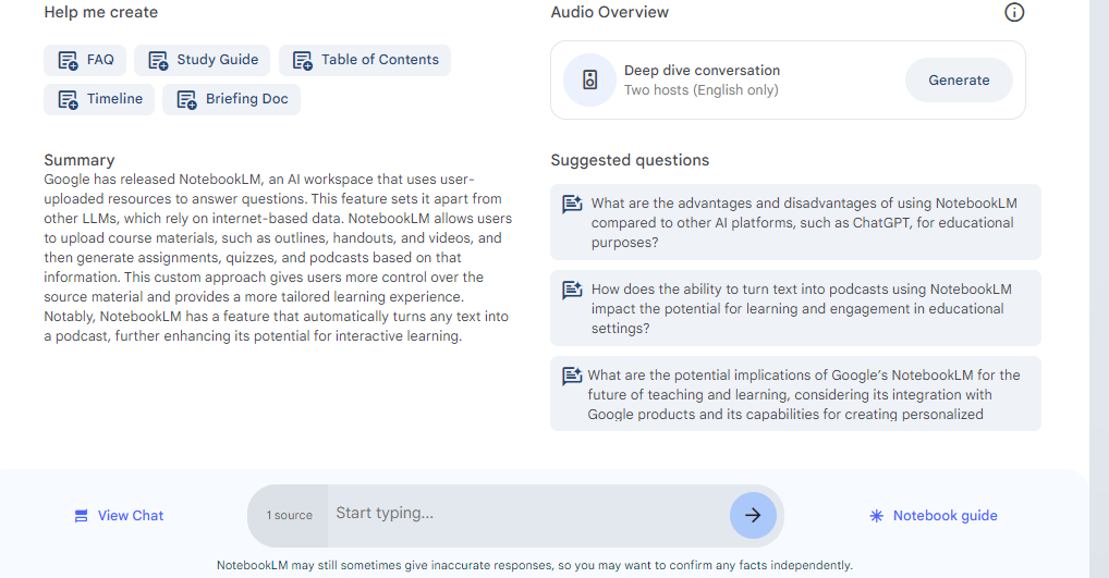 However, it looks like Google has arrived with the first killer app. Let me explain, and then give you a few examples of how you might use this in class. NotebookLM is Google’s free AI workspace and it is different from the regular LLMs in a very important way. While LLMs rely on their training to give you the best answer to your question, the answer is scoured from the internet, and it may not be everything you hoped for, as a teacher. In fact, as you follow up on your original query, the results will likely suffer from “drift” - straying farther away from your original information as you continue. NotebookLM on the other hand, uses your own uploaded resources as the source material for its answers to your questions. Think of it like a custom AI that has an excellent understanding of your course or unit, and it answers questions based on that (more limited, perhaps more appropriate) source of information. A caveat: as with everything else that’s free, if you’re not paying for the product, you ARE the product.