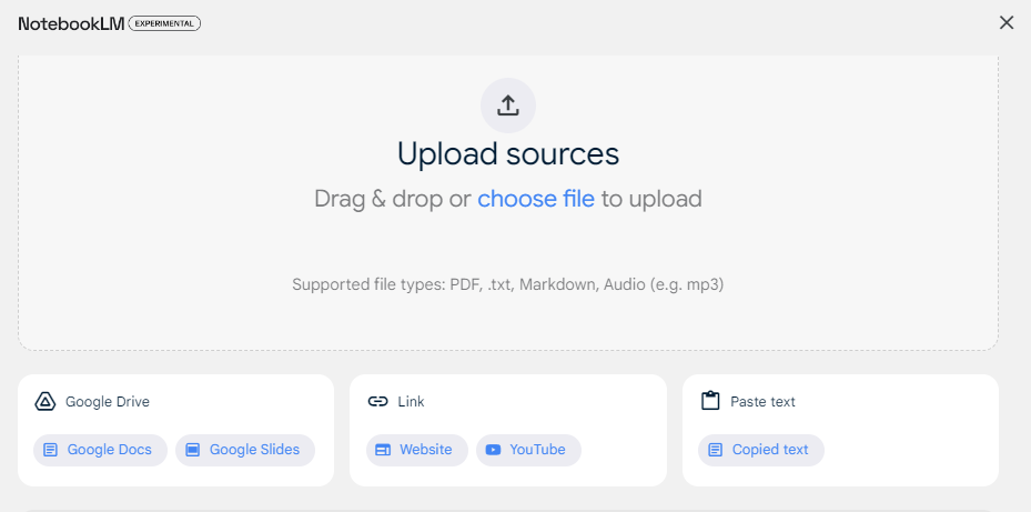 How to start with NotebookLM? Go to notebooklm.google.com and see if it is enabled for your domain. If not, ask your administrator to enable it for teachers (I suggest waiting to enable on student accounts until teachers have had some time to experiment). Start a new notebook, or browse one of the samples included. I think you will have the best experience if you create a new notebook for each major unit in your course. (As always, I suggest taking a slow and steady approach, rather than a “move everything into NotebookLM right now” approach.) A notebook can have up to 50 sources, which is probably enough for your handouts, slide shows, and online resources for a unit, but likely not enough for your course. See the image below for the easy interaction with Google products.